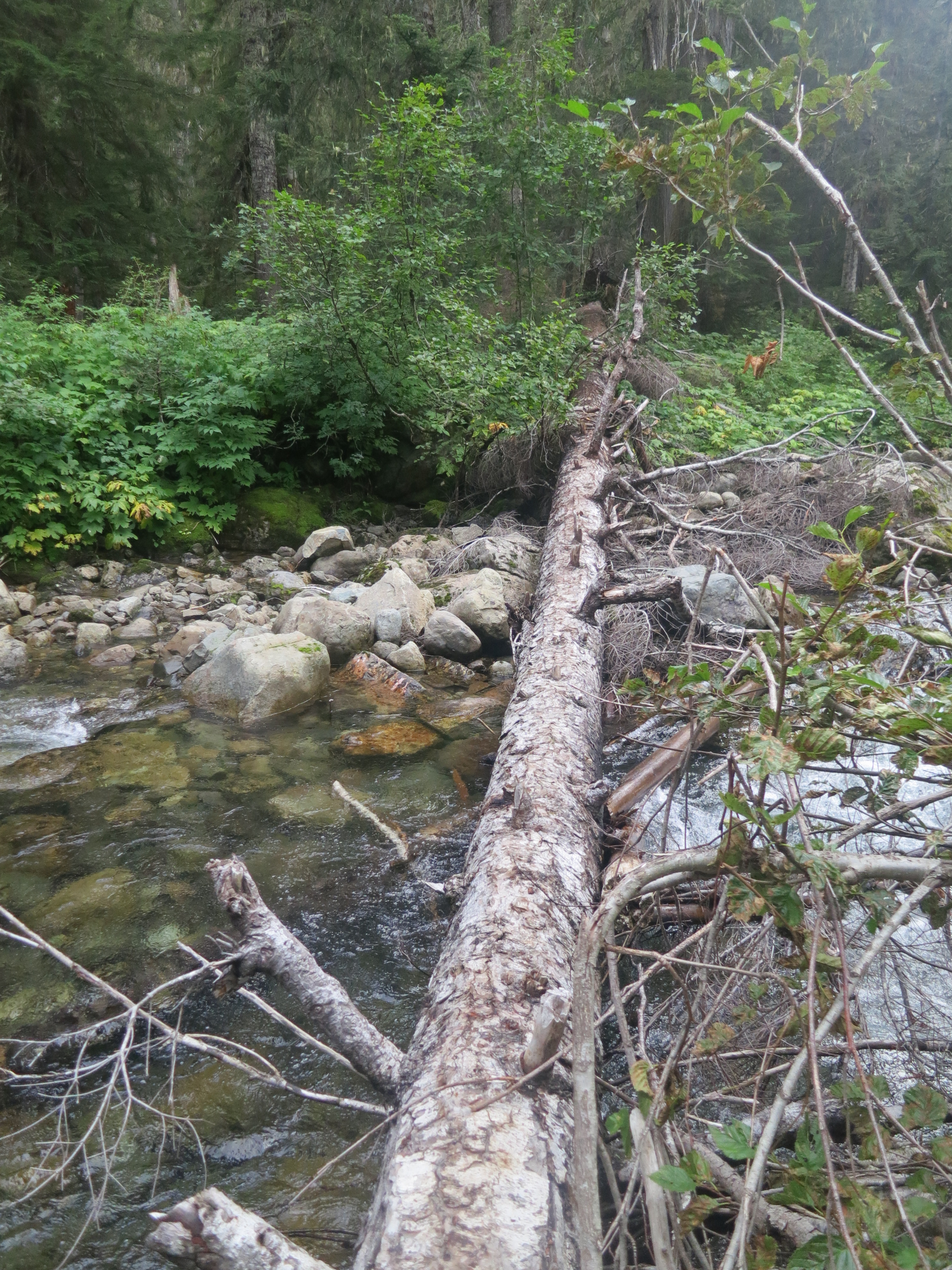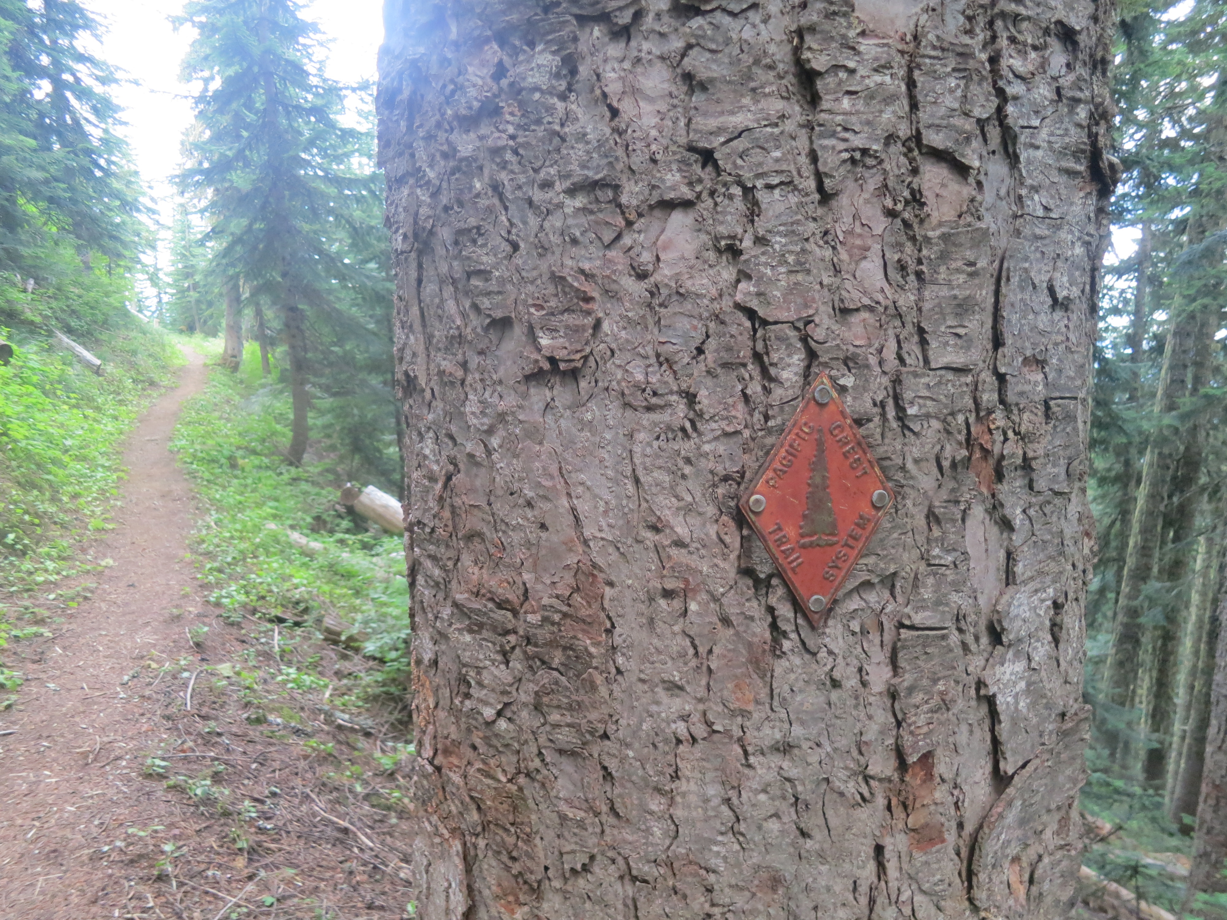 In eight and a half miles, I reached a creek, where I stopped for my ice coffee break. The sun was shining brightly and I took the opportunity to spread out my wet items to give them a chance to dry. I hadn’t seen anyone else this morning so far, but kept expecting to see one of the other thru-hikers who I knew were close behind at any moment. I enjoyed some more of the Polish cookies and junior mints, filtered some fresh water, and then headed on my way. Soon, I found a note left in the middle of the trail. It was written by two thru-hikers that I had met in the desert and who I hadn’t seen since. I didn’t have the best energy with them. The note explained that there was a wasp nest right on the PCT about 25 yards ahead. They had made a little drawing, advising how to get around it. I stared at the little piece of paper for awhile, trying to figure out its orientation and what I was supposed to do. Part of me wanted to ignore it. I had not been stung at all the last time I passed by a nest. This time probably wouldn’t be any different. I figured out that they were advising to bypass the switchback up ahead and cut up the slope. Since I didn’t know how far ahead the nest was, I figured I might as well start the bypass here. The problem was, the hill was incredibly steep! And it was also very slippery! I had to dig my poles into the ground and bear my entire weight on them with each step. Once I made it a fair distance up, I needed to get over another fallen tree. With one foot over, the other one slipped and my leg scraped against the bark. The wood was slippery from all of the rain! I had no choice but to keep going. Blood was running down my leg and the cuts were stinging. I probably would have been better off risking being stung. I wished I hadn’t followed their advice after all.