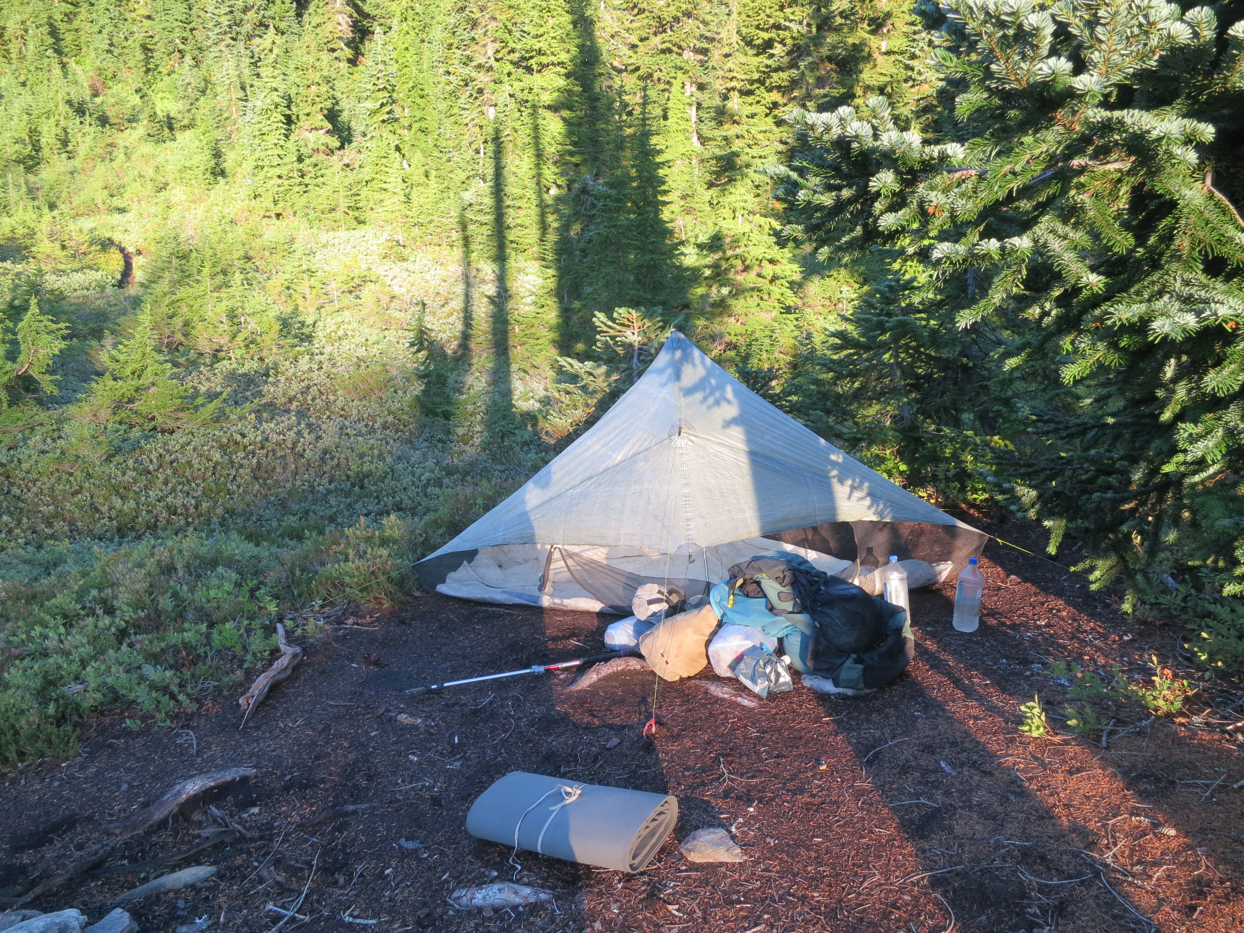 I struggled with my tent set-up once again, staking and re-staking the lines to try to fit within the barriers created by logs on either side of the patch of dirt. I felt exhausted.