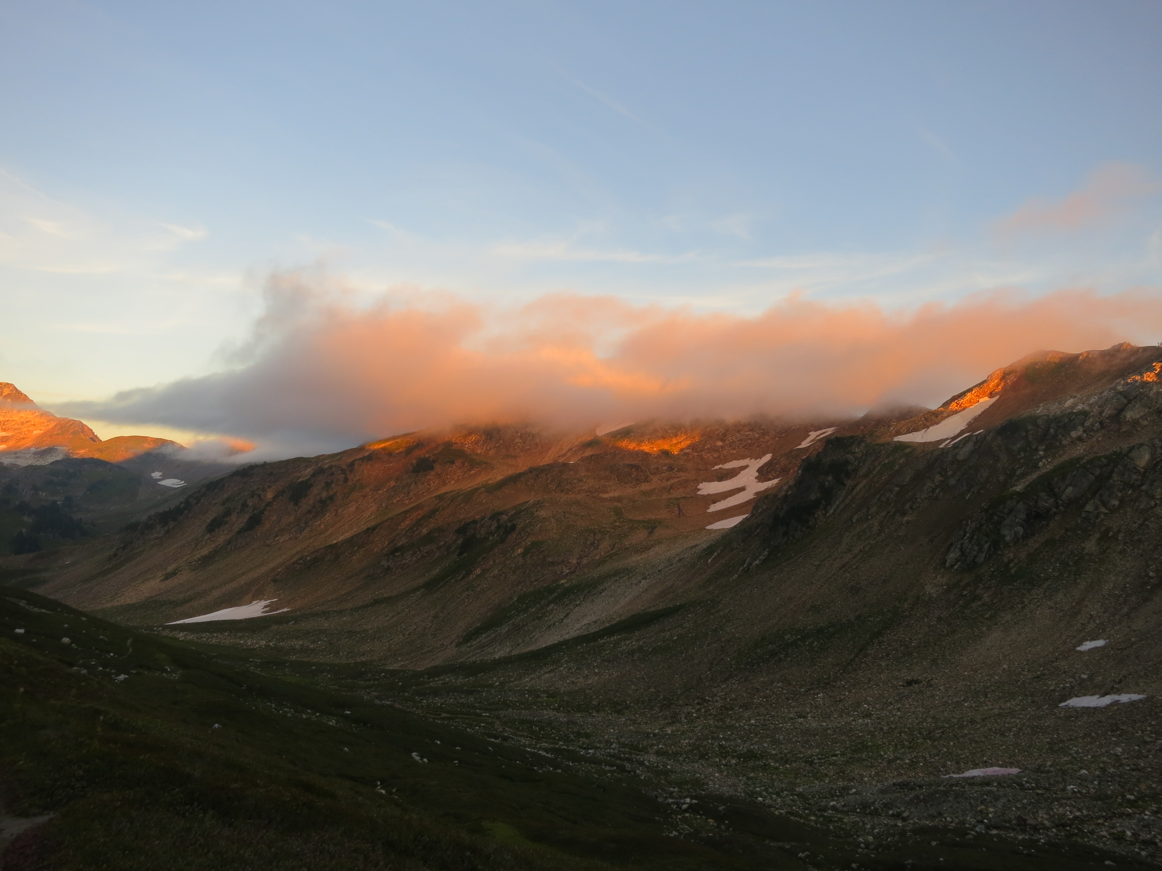 The setting sun was casting red shadows on the mountain tops in front of me and I stopped often to take pictures. It was unbelievably beautiful! It was also getting very cold! Once I reached a nice cascade of water, I stopped to fill up and sat for about 15-20 minutes filtering it. I still had a good mile to hike before I would reach a camp site and the sun was quickly disappearing.