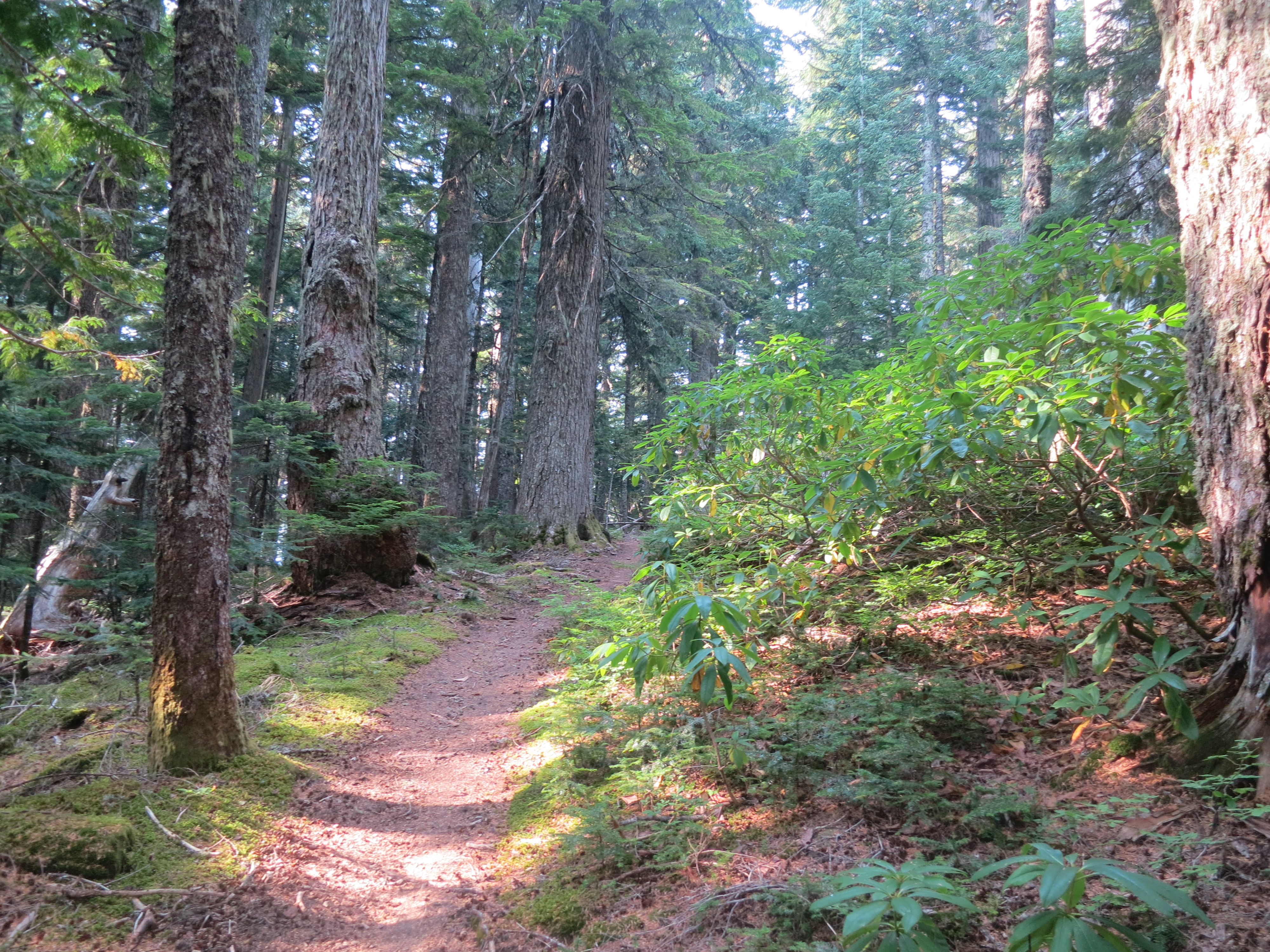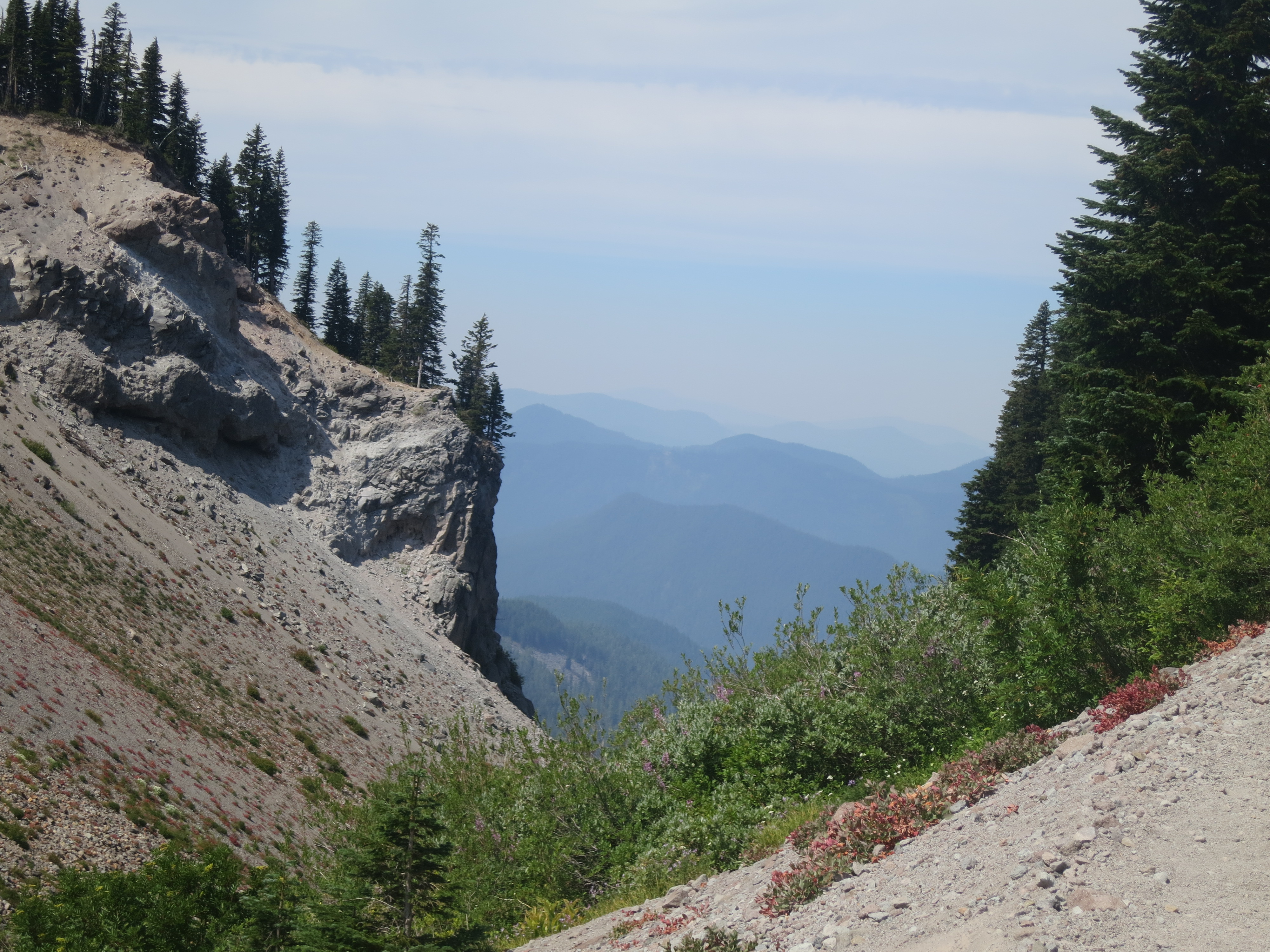 About four miles later, I found them sitting along the trail, near a side path to a spring. They greeted me nicely and I went over to sit with them for a couple of minutes. The spring was only about 50 feet away, but I didn’t feel like checking it out. I had plenty of water on me. Tumbleweed was talking about how Peter Pan had assumed that he had lightened his pack over the course of his hike and how opposite that actually was. He had added more things as he went along. I knew exactly what he was talking about. That was what had happened to me on the AT! I felt like I kept my base weight fairly constant over the course of this hike and told them that I had never been a light-weight hiker. The boys looked at my pack and said it looked small to them! I am sure that was the first time anyone had said that about my pack! We all headed out together and continued the climb. At a small opening through the woods, we got our first glimpse of Mt. Hood.