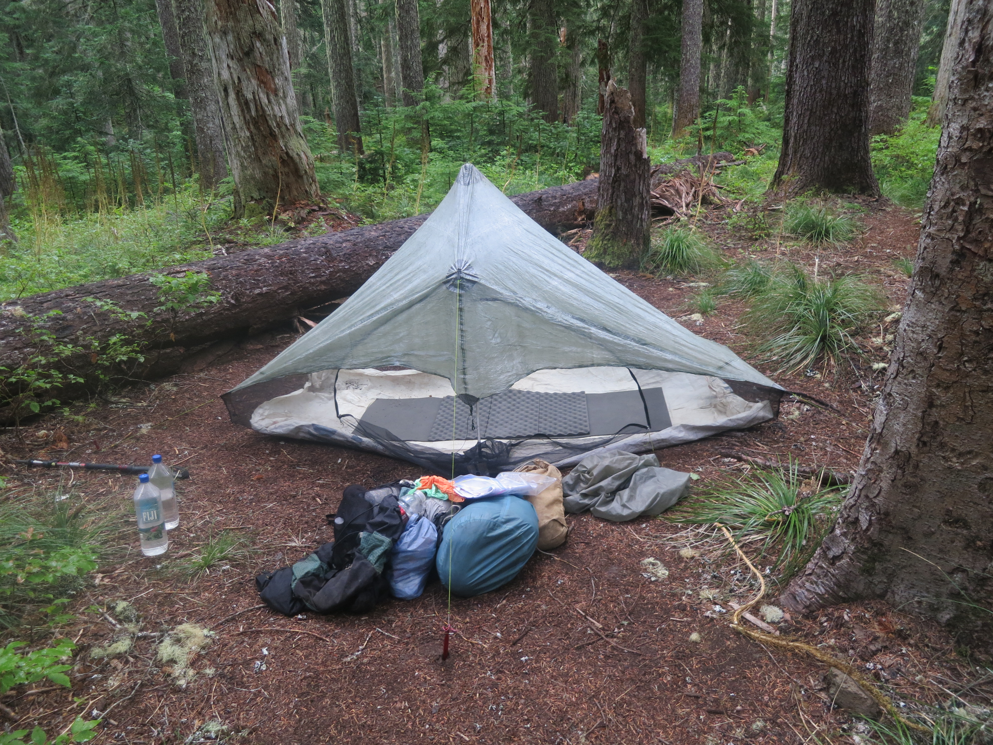 The lady who was in her tent before I arrived last night was the first one up. I shifted around for several minutes, hearing her move in and out of her tent and then finally sat up. I still felt tired. As I ate my breakfast, the nice girl in the green tent came out and gathered her things for breakfast. She sat on a stump in front of a little table, near the head of my sleeping bag. The other woman joined her and asked about her hurt foot as they shared the hot water for their coffees. I listened for awhile and then eventually got included in their conversation. At some point, she started talking about how they had planned to have some of their resupply boxes brought out to them by their good friends in Portland. They quickly regretted this idea when they found that even after only a few days on the trail, they no longer had much in common to talk about. She said that next time they hike for several weeks, they will just mail themselves their resupplies and be more fully immersed in what the trail has to offer. I found her story to be very interesting, especially after my experience in Bend. I thought that the interactions with my friend from high school, who I have barely interacted with since, and who has a much different kind of energy than me, were difficult mostly due to personality differences, but listening to Ashley made me feel so much better about what I had been feeling. Ashley and Sean were very nice, relaxed, and cool people who, I would imagine, would get along with most people easily. She said that at home, they have lots of things to talk about with their friends and enjoy their company, but while in this experience, they were living in a very different world and found it difficult to connect with the kinds of things their friends were talking about.