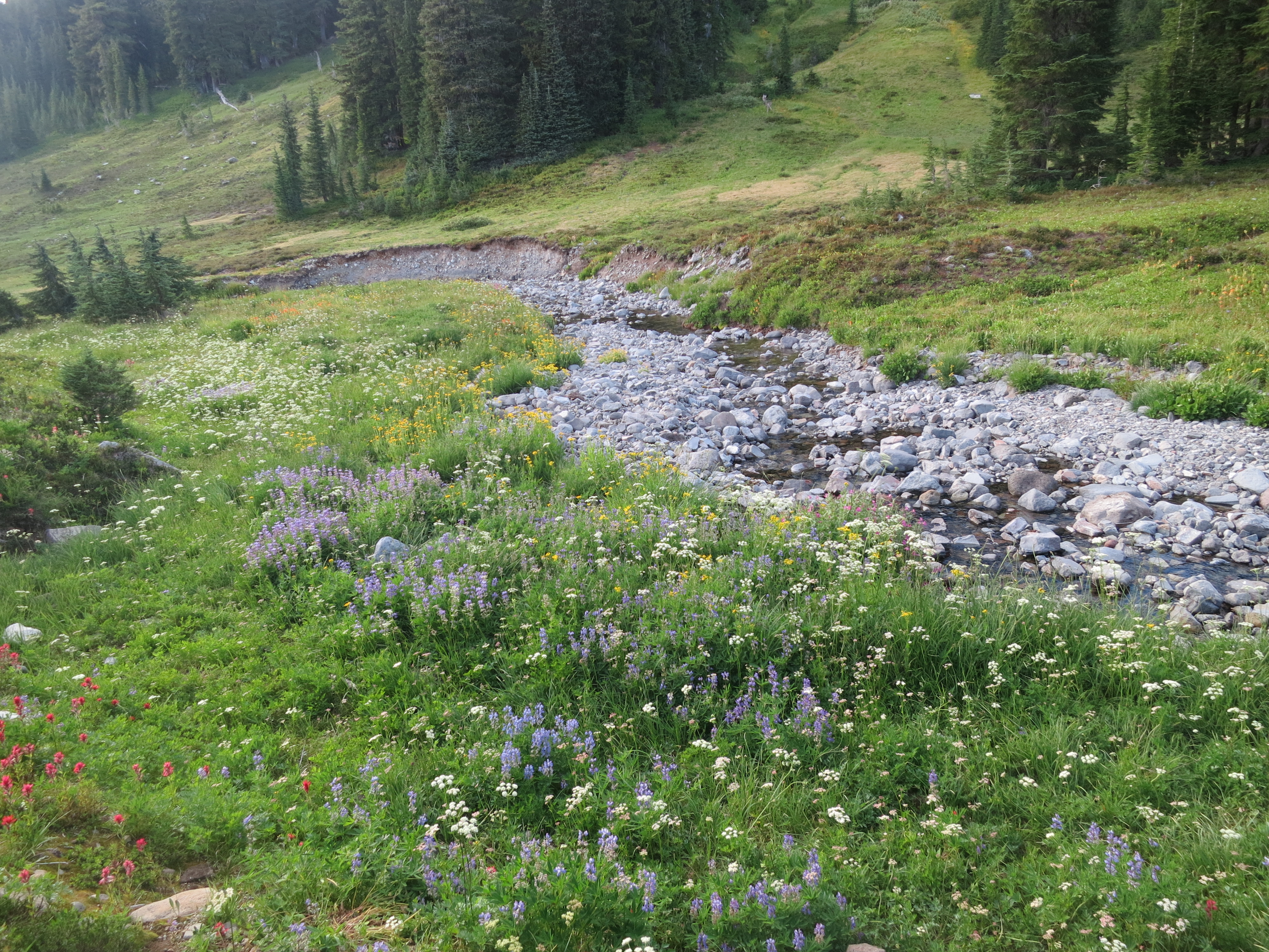 I kept plodding forward, checking my watch, and hoping that Connie would still be there. Mt. Hood now loomed in front of me and I kept stopping to photograph it. Pretty flowers of different colors dotted the forefront.