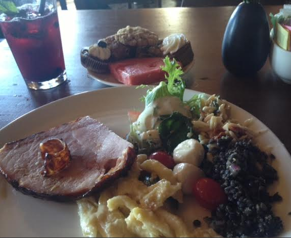 I was able to get into my room and drop off my pack before lunch. It felt so wonderful to have some private space! Although the beds were twin ones, they were fluffy and high off the ground, and the bathroom was nice. I headed down to the lunch buffet and stood in line, waiting for the mozzarella salad, black bean orzo, pasta, ham, and an assortment of dessert pastries. Puma and Tumbleweed were sitting at a small table with StoryTime, who had also just arrived. There was no room there, so I just sat at my own table.