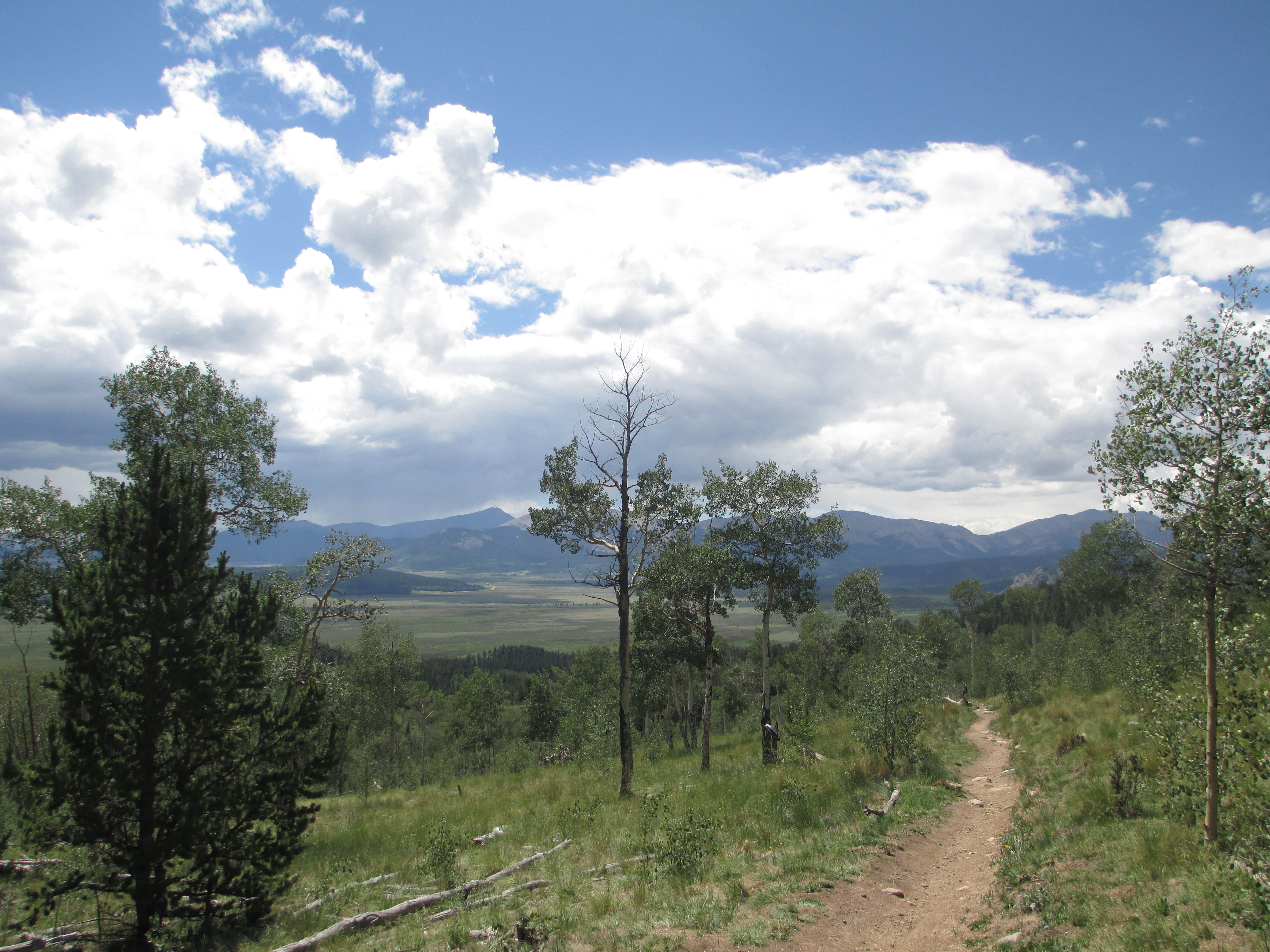 The trail was not well-marked in this area. I would come to forks, look at my guidebook pages, and receive no indication as to which way the trail lead! Luckily, at an intersection ahead, someone had hand written a “CT” and an arrow, so I knew which way I was supposed to go. I started descending the switchbacks. My pace considerably slowed. Several mountain bikers came whizzing by, and each time, I would have to step off the trail and let them go by. I had been unable to charge my ipod before this trip, rendering it useless, so I couldn’t bring it. That turned out to be a good thing, because it would have been dangerous to be on this trail with all of the mountain bikers flying towards you without notice, unable to hear them and quickly step aside! I sat down on the side of the trail for a break and checked to see if I had any cell service. I was getting exhausted. After finishing the switchbacks, a very outgoing cyclist in an orange shirt, in his fifties, came towards me, letting out whoops. “Are you all alone? Where are you going? You’re brave!”. In a loud voice, he shouted out, “This is a national scenic treasure you’re on! It’s way better than the PCT or the AT! You can see all the peaks!” I wanted to tell him that it was me and him, out in nature and that he didn’t need to talk so loudly. He started naming the peaks. “I’m sure you’ve researched them,” he added. (Actually… no, I had not…). “I hate the Collegiate Peaks!” he continued. “You know why? Because they are so dry!” I thought I was finished with the driest sections of the trail. I guess not… He then told me about a bike race that would be starting in another week, along the same route I was traveling, from Denver to Durango. He told me that the bikers camp along the way. that it is a self-supported race, and the first one to Durango wins. “I think you are going to enjoy it,” he told me. I was so exhausted… I had just hiked 20 miles and wanted to relax and rest. I didn’t have energy to create conversation. He took off and said he would see me in a little while.