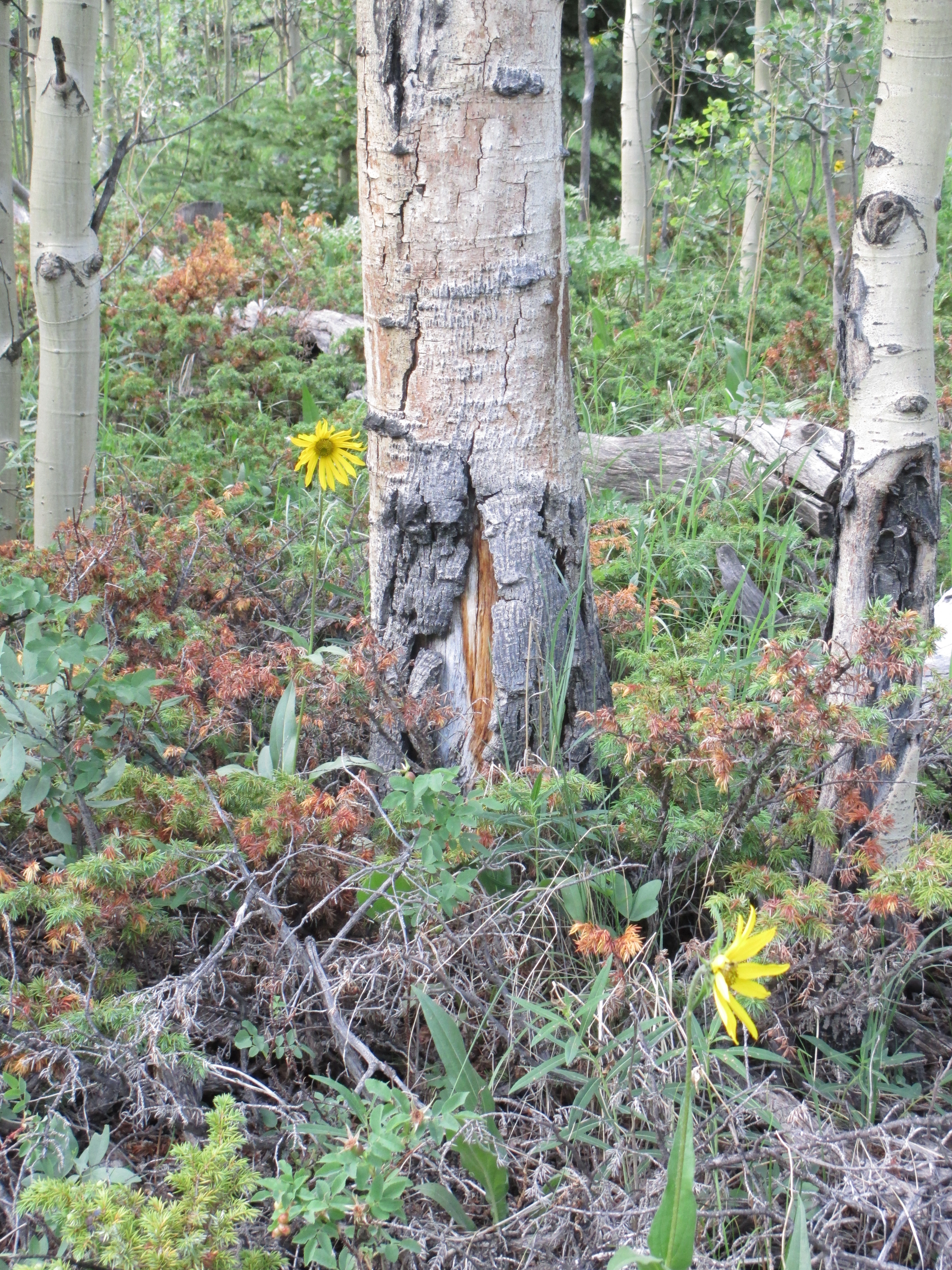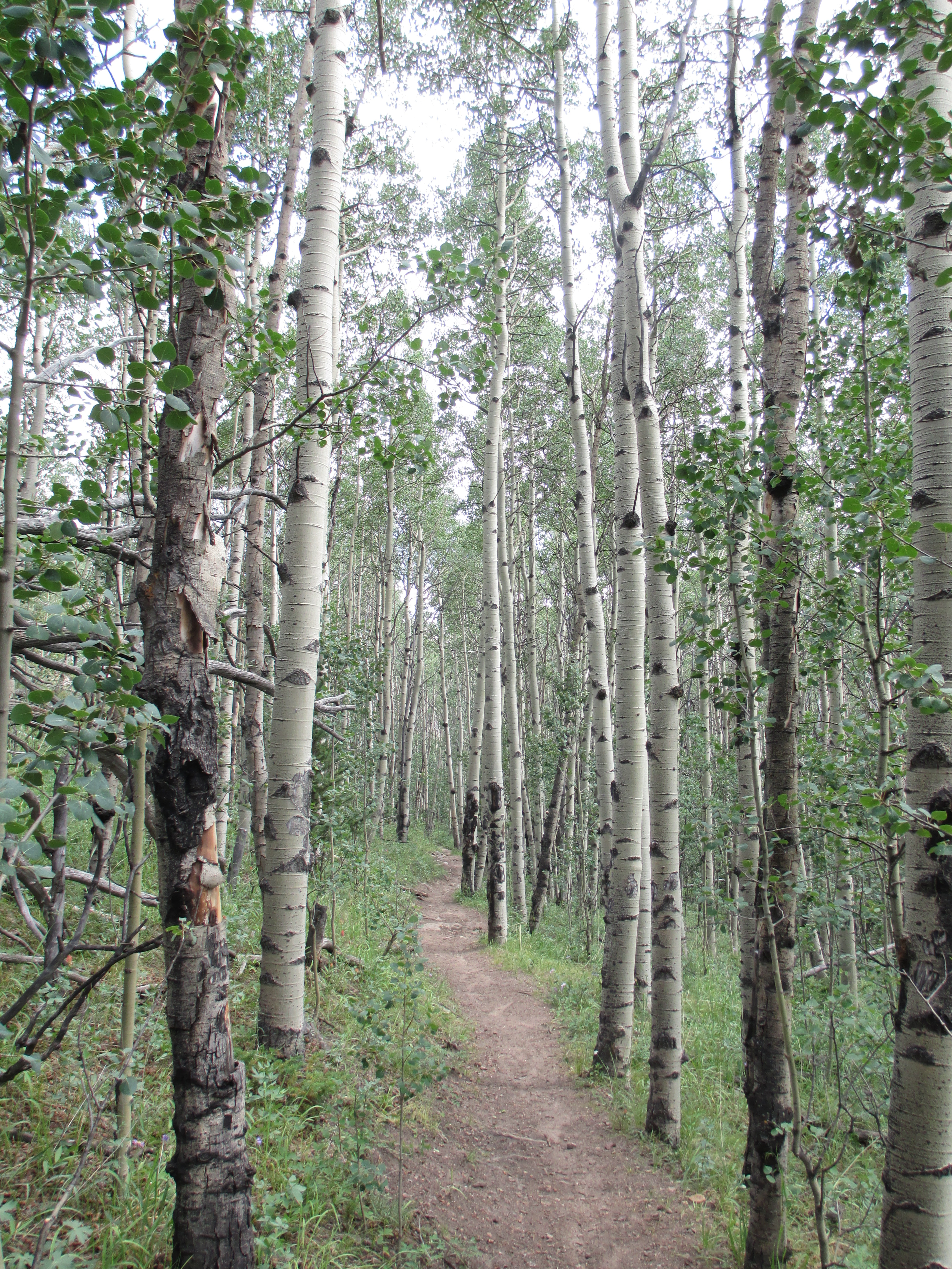 I took a small break and continued walking. My plan was to camp a few miles away from the trailhead and hitch into town the next morning, so I could make the best use of a motel room. Then, thunder started to rumble… Sprinkles of rain started falling. And the trail was continuing to climb! I needed to find a place to camp- away from the lightning- but I didn’t see anything. I looked at the elevation profile and estimated that I was at mile 12 of this section. There were 3.1 more miles to the end of this segment. It was now about 3:40. I decided to make a push to the end and hitch the 20 miles into town that evening! There was no point in staying out in another storm, with no good spots to camp. I noticed the beautiful aspen trees and flowers along the last stretch, as I hurried along. Maybe because I was now on a mission and was trying to hike as fast as I could, my awareness of the things I was missing and would have seen if I had taken more time became stronger.