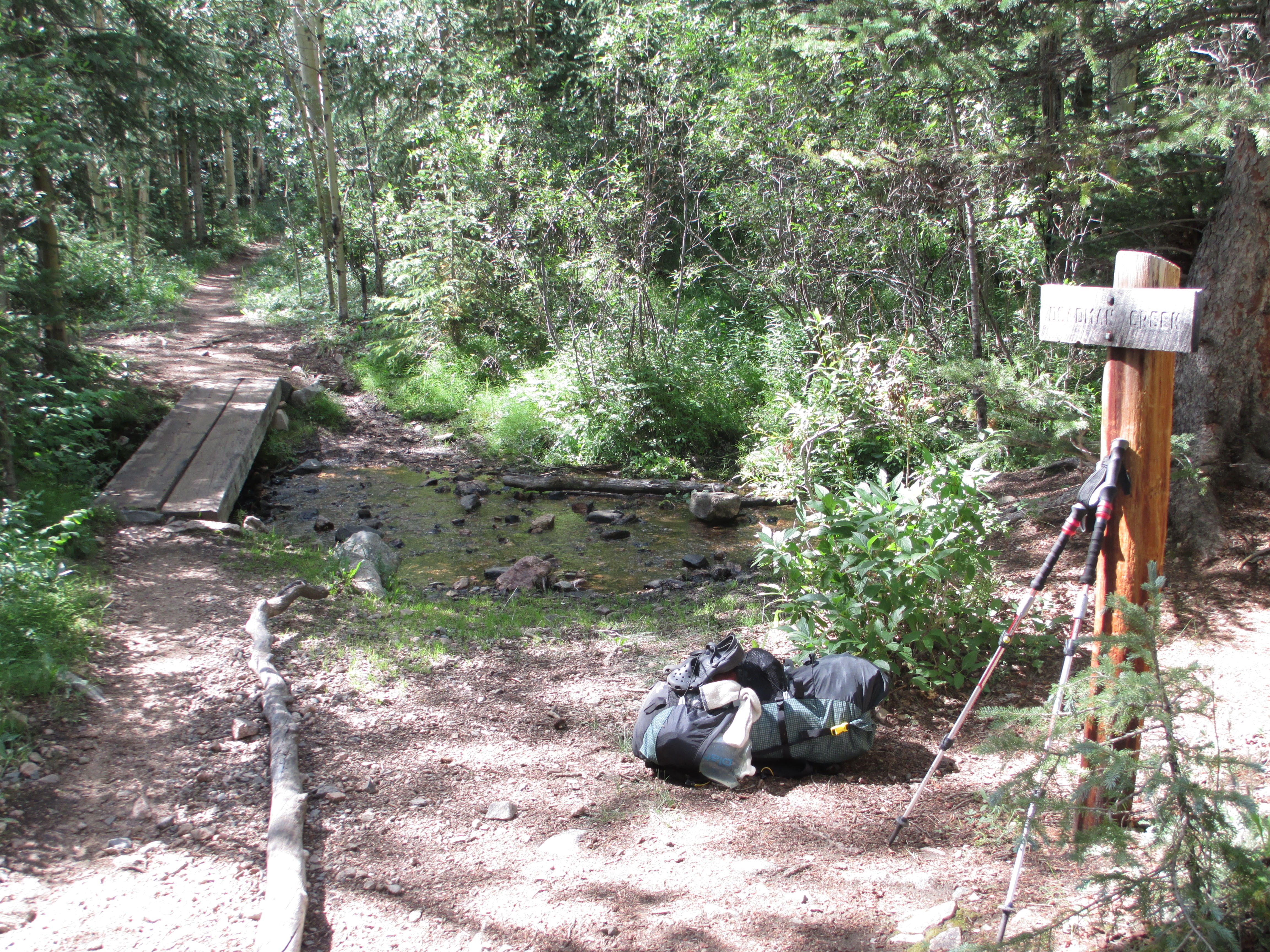 I had planned on collecting water at the next source, but when I reached the stream, the rain was still coming down, and I didn’t feel like stopping to filter it. I still had visions of reaching a road crossing and having “my friend” from home come meet me. Where could he find me? I would be reaching an intersection later on that day with a 10 mile path toward Creede. The first two miles weren’t accessible by vehicles, so if he met me there, I would have to hike an additional 4 miles. I still had no reception…