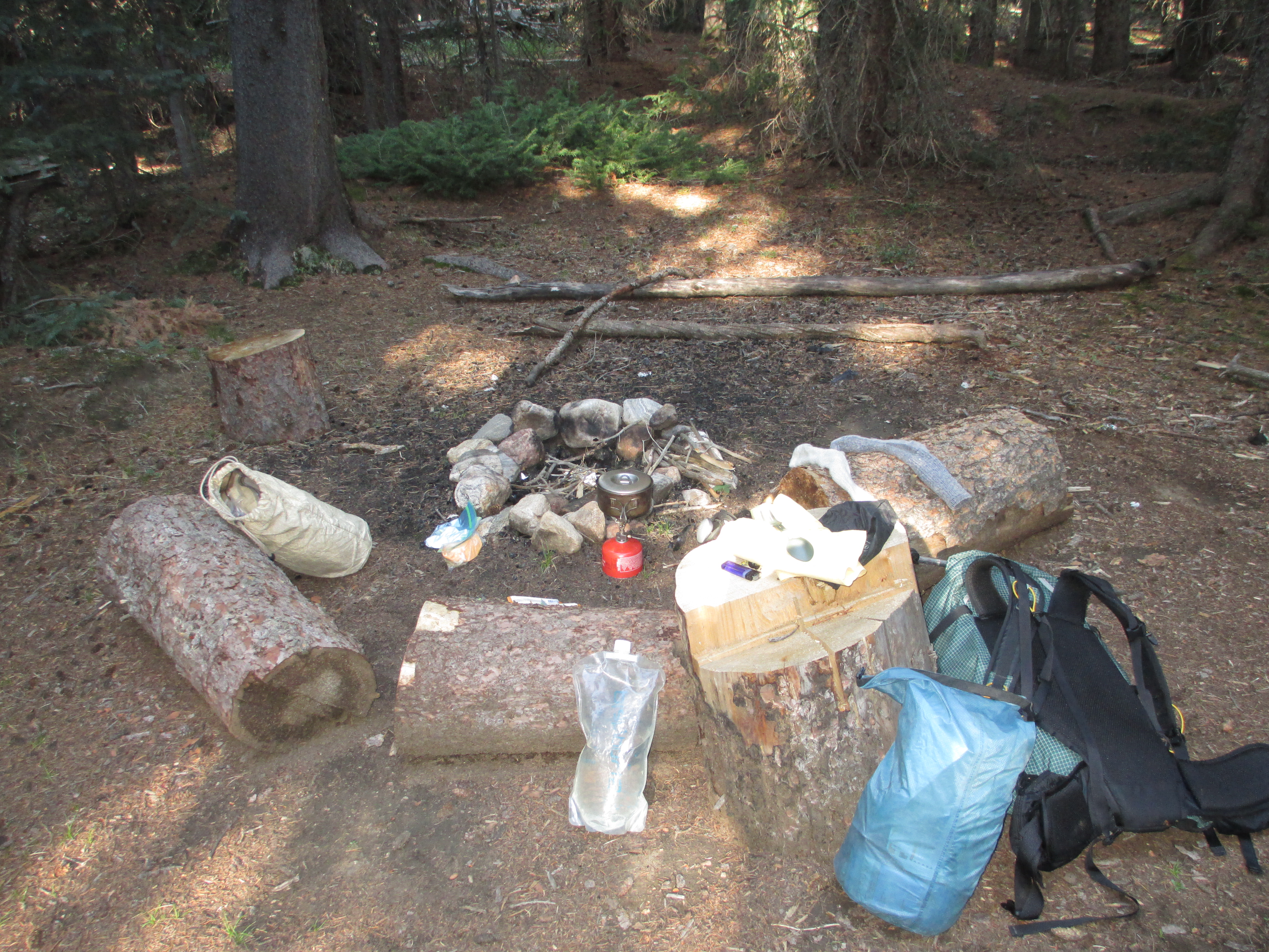 I walked over a mile in the rain, and then started to get tired again. I also had to pee. I found a couple of large trees with dry pine needles underneath, so I put my pack down and took a break there. I looked out in the direction I would be going and saw the rain coming down. And then, I looked back towards where I had just come from, and saw no rain in the air! I was standing right on the rain line! Incredible! I left the protection of the tree and continued through the meadow. Looking up towards my right, I saw a man setting up camp, but he did not see me. The rain had stopped and it was now hot out. I felt tired and found a nice flat rock to eat a power bar on. I decided to lie back on the rock and rest for awhile (something I rarely give myself permission to do). The sun was bright and I needed to shade my eyes with my hands. Within a couple of minutes, clouds began to move across the sky. More and more clouds moved in, filling up the sky, and the temperature immediately got cooler. A storm was coming and I needed to find a place to set up my tent! Thunder began to rumble. Most of the area was covered with thick plants and rocks and my eyes scanned the landscape for a flat area. I was also looking for a place where I could collect water. I found a small, exposed clearing on the side of the trail, but decided to press on. To my right, up a slope, I saw a stand of pine trees and decided I could camp underneath them. So I veered off the trail, headed for the trees, and dug my tent out of my pack. I had a hard time staking the tent because the ground was so hard! I looked around for some rocks that I could use to pound in the stakes and came across a campfire ring and the skeleton of a large animal! This was an actual campsite that I had found! By 4:30, I managed to get everything inside my tent and I stayed there for the next 2 hours, as the storm came in. At first, there was sprinkling rain and lightening in the distance. Then the wind picked up and the thunder grew louder. The temperature dropped from 80 degrees to 70 to 50! I put on my fleece pull-over and my rain clothes and got into my sleeping bag, fading in and out of sleep while lightening flashed all around me! I was weathering my first Colorado storm! Eventually, it passed, and I emerged from my tent to cook some mac and cheese. I added salmon for more protein, but the whole meal was cold and disgusting! The processed cheese remained hard and clumpy, and I just couldn’t stomach the taste. As I crawled into my sleeping bag for the night, I realized that I had hiked 50 miles of the trail so far- already 10% of it!