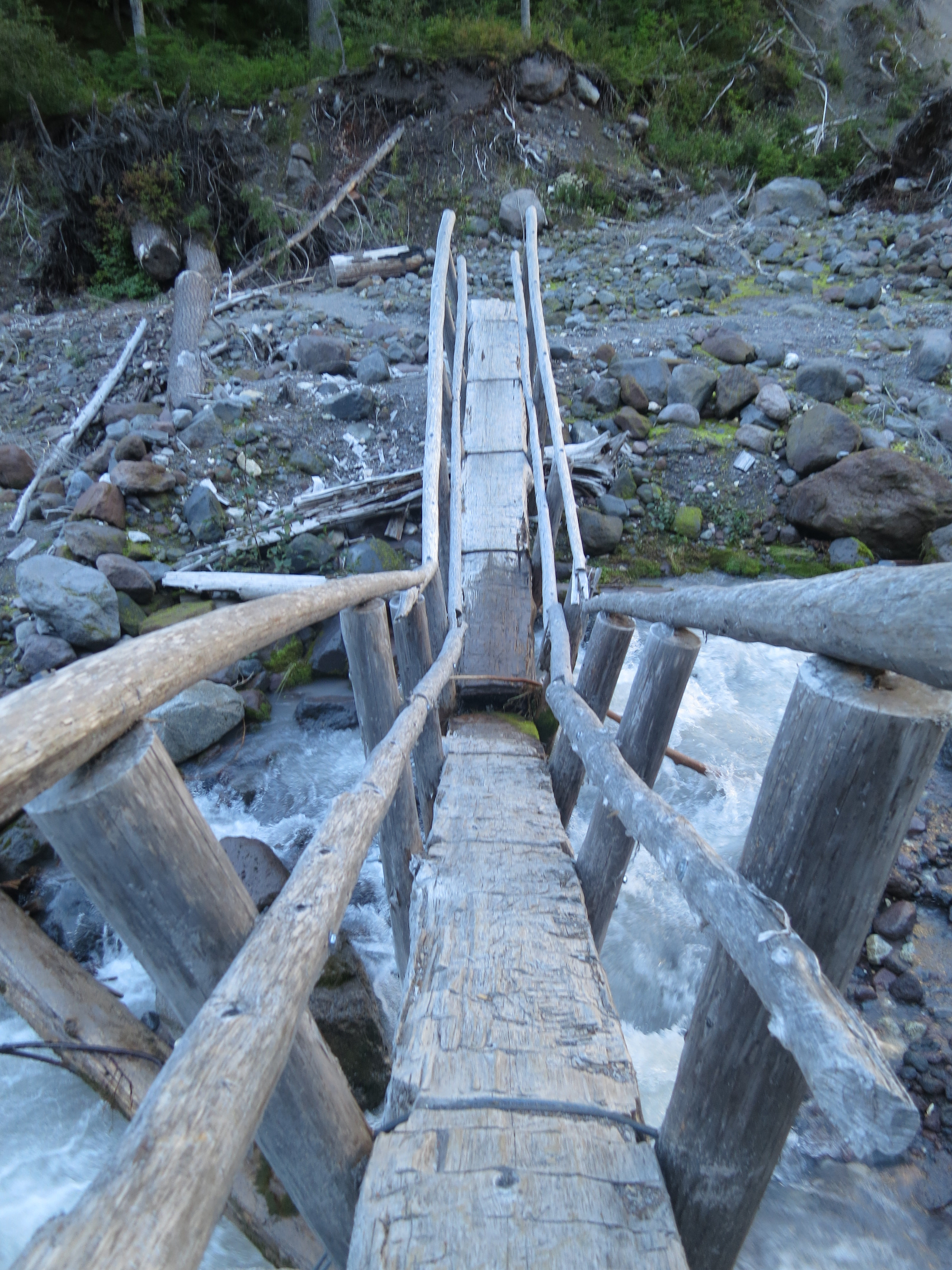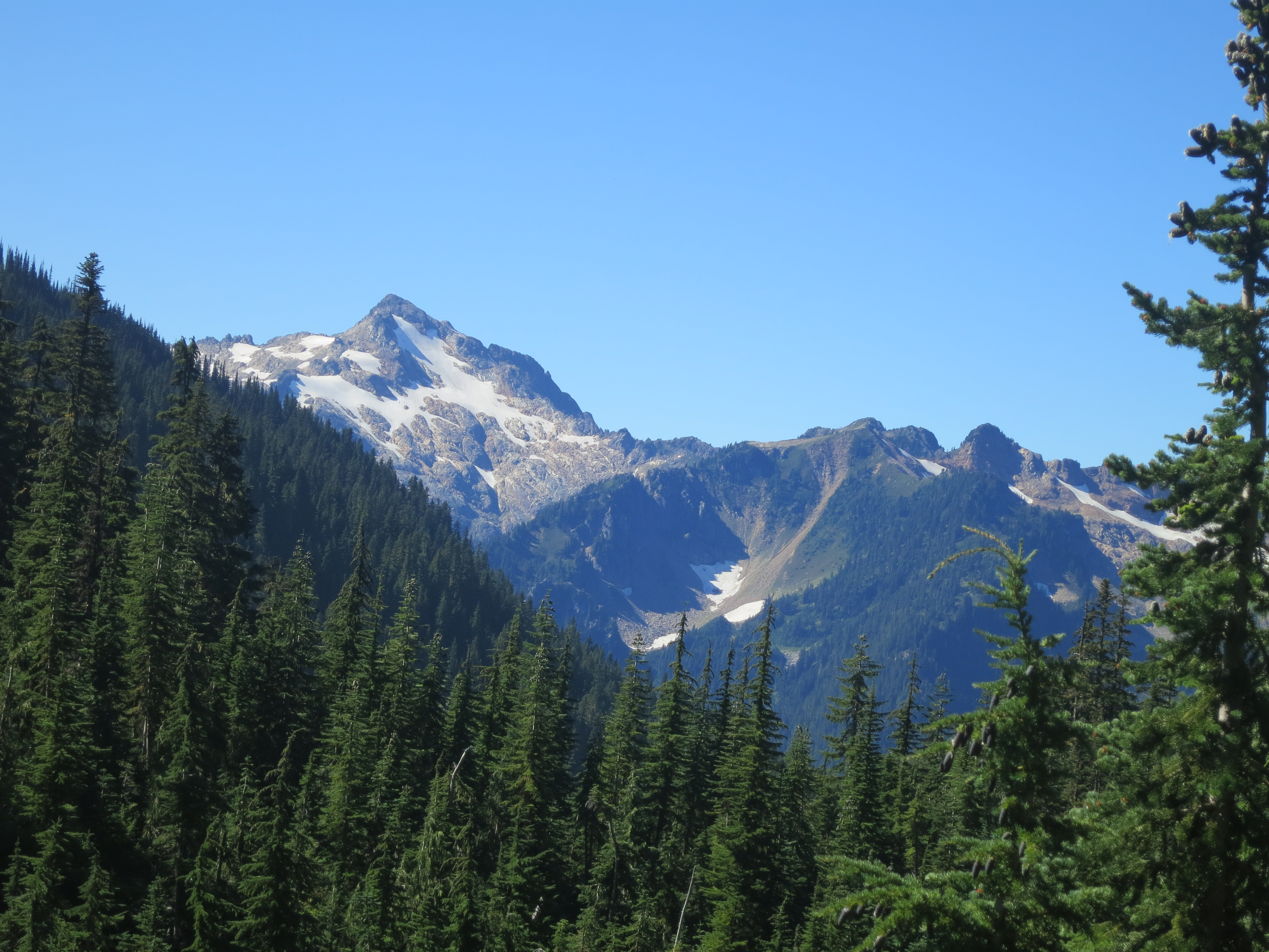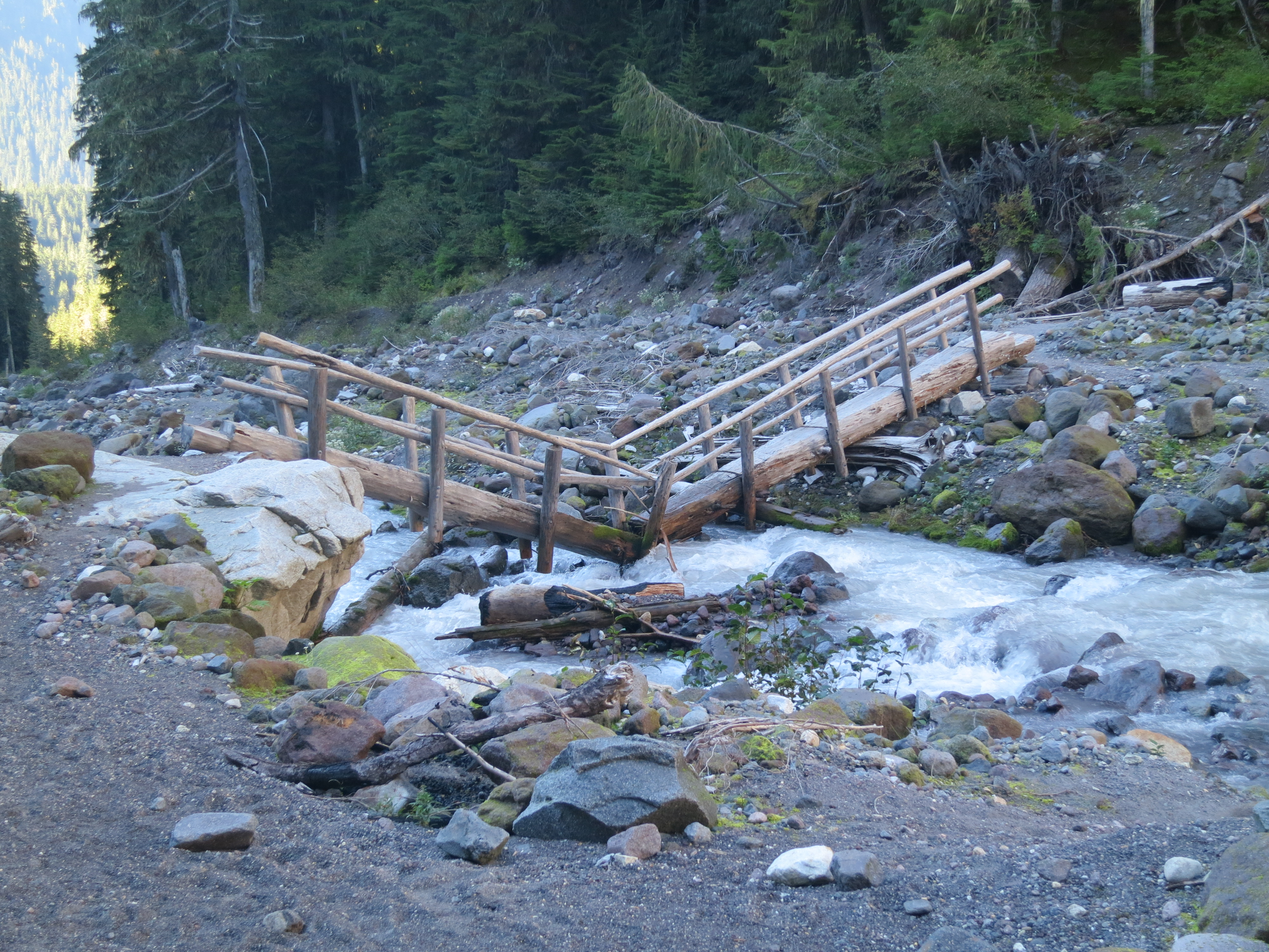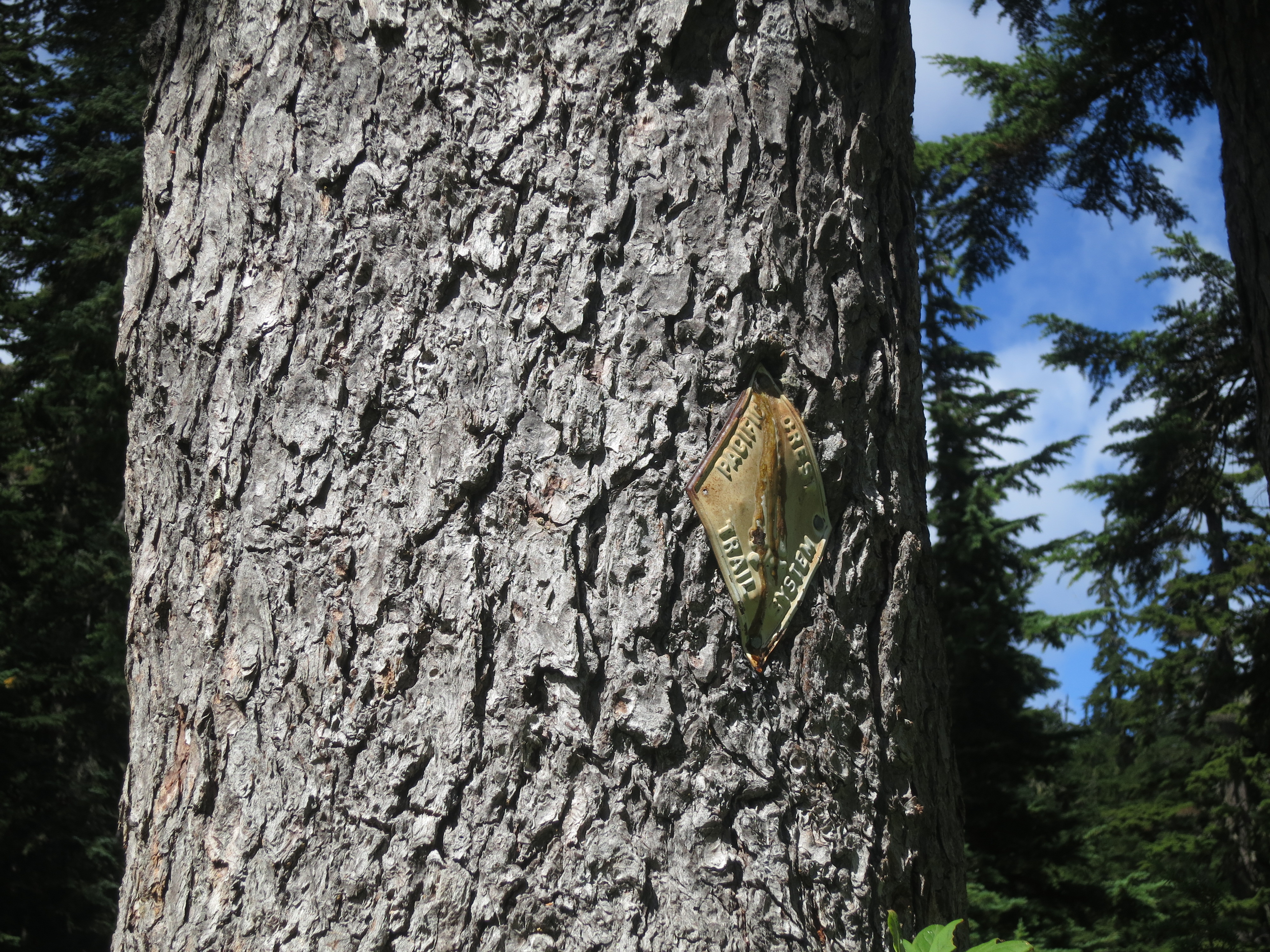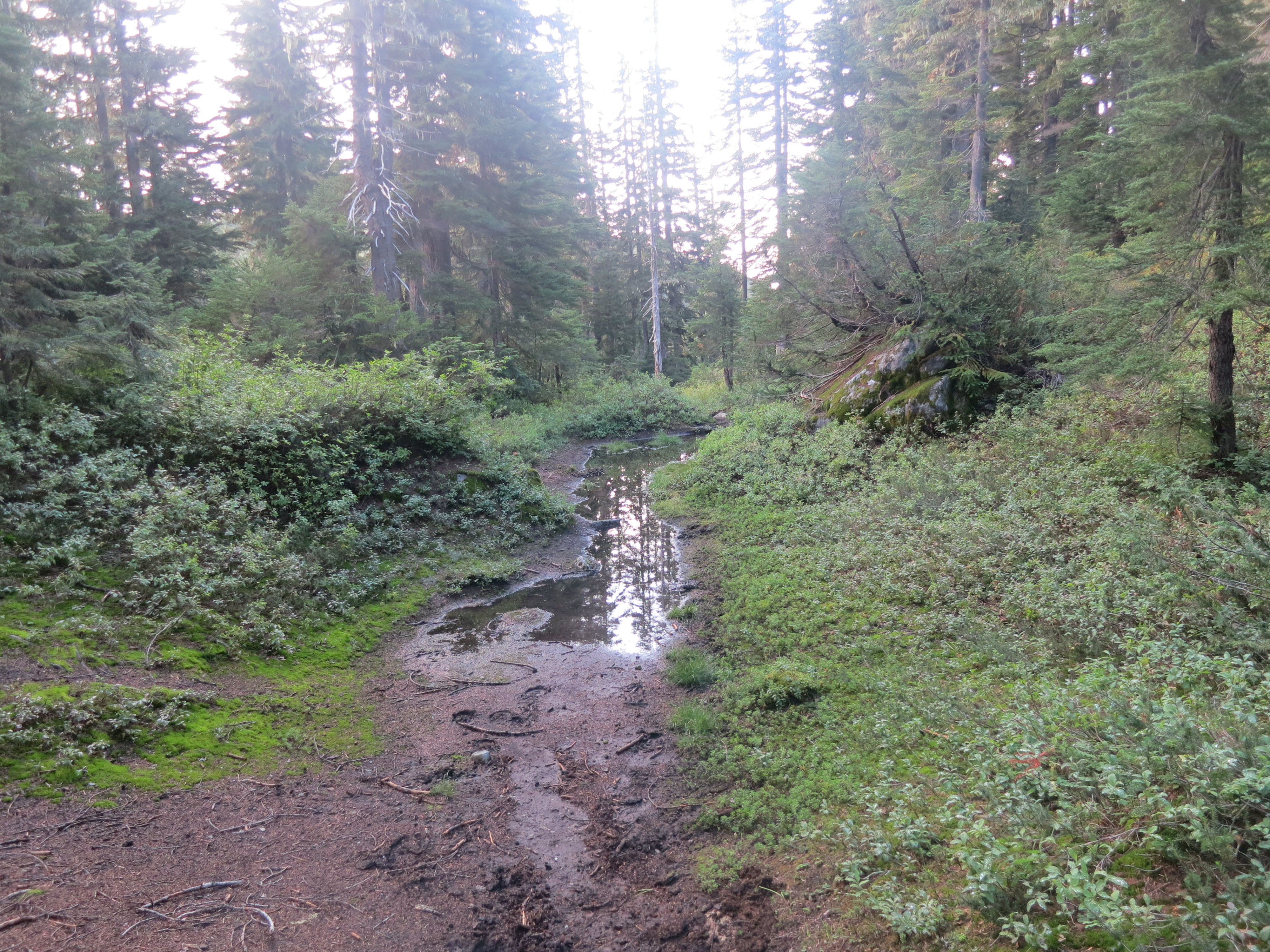 At 7:44, I started walking. I had less than ten miles to get to the road from which I would get into the town of Trout Lake, which was my next resupply point. After stepping over Steamboat Creek, I came across a big bullfrog scrambling up the bank along the trail to get out of harm’s way. He was the biggest frog I had seen on my journey so far!