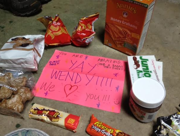 I headed to the picnic tables outside of the store and put my pack and boxes down. I didn’t even notice that Puma was also sitting there until several minutes later. When I was about to head into the restaurant to get something to eat, I was startled to see Warner Springs Monty headed towards me. He said that someone had told him that someone named Wendy was sick. He checked my blog and discovered that it was me. He offered to take me to a hospital if I needed it. I went inside and ordered a hamburger and lemonade, which I had planned on eating outside with Puma, but now felt like sequestering myself away… At least I could charge my electronics while I was in here. I was also able to text a bit with Connie, which was nice. Monty came in and asked if I would be ready to head back to the trail soon. I said that I still needed to sort through my resupply and organize everything. Peter Pan had offered to take Puma and I back. Everyone was fine with waiting, so I got a piece of chocolate cake and a coffee for dessert and bought a huckleberry scone to take with me on the trail. As I sorted through my things outside, a nice older couple began chatting with me. The man had been suffering from early stages of Alzheimer’s, but was having a good day today. They love visiting Trout Lake and don’t mind making the long drive. Before they left, I got a hug, my picture taken, and a promise to look for my book in their local library (they don’t have the internet!). I told them it was going to take awhile…
